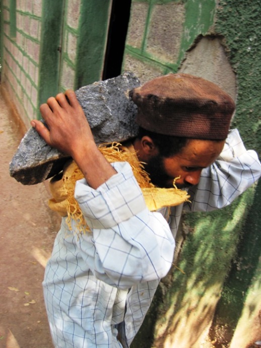Rocks had been brought up from under the waters of the lake, and were piled on the shoreline. They were being carried from there up to the church…