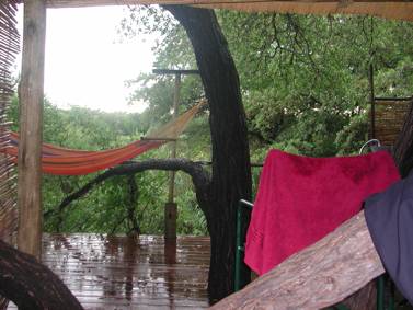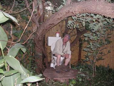We later decided to take the “ablution tour”… Whoever built this camp had a rather strange sense of humour. There are various working toilets scattered throughout the camp, with names like “View with a Loo”, “Boskak”, “His and Hers”, (featuring two toilets side by side, hers with a pink mat and his with a blue one!), “Thunderbox” and “Toilet in Eden”. We were amazed at what we saw and decided to try and make use of as many as possible during our stay. I can tell you that it is a little disconcerting making use of these facilities, as none of them has a door of any reasonable description… The only thing stopping another guest from walking in on you is a little stick which you are meant to hang across the opening… Time spent in these ablutions is therefore of a very short nature… Allan was unfortunate enough to make use of one just after a short rain-spell, and found to his annoyance, that the toilet roll had been left in the rain by the previous occupant, instead of being put back in the plastic container provided for it…..
