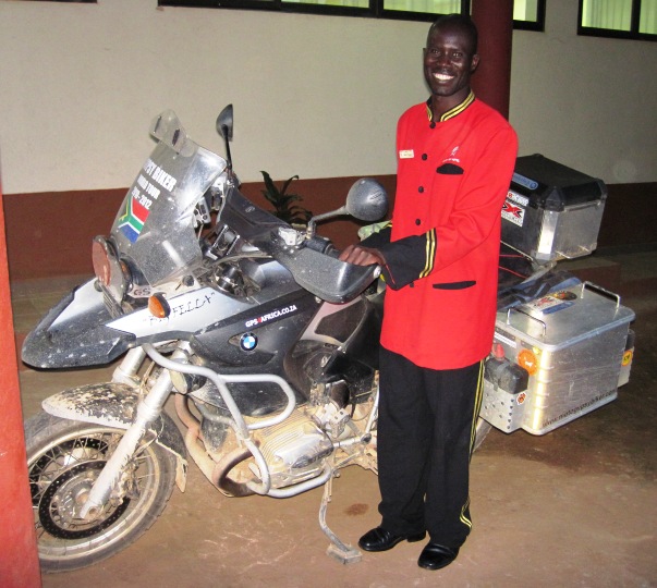 The bike was covered in mud again, but at least I was drying out, and by the time I reached the outskirts of Kampala 90 kms later, I was almost dry… It had taken me just over ten hours since leaving Kigali earlier that morning, to reach the Sports View Hotel on the Eastern edge of the city… Emmanuel the porter rushed out to welcome me back, the security guard at the gate had lifted the boom without asking me to fill in the bothersome forms that all vehicles need to complete before entering, and for the next hour, I was subjected to many “Welcome back’s” and “Where have you been’s” by the staff… The receptionist very kindly told me that she had reserved a cheaper room for me on the first floor, so that I did not have to carry all my stuff up six flights of stairs… Emmanuel breathed a loud sigh of relief…