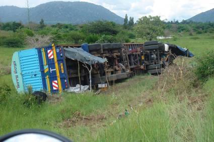 Just after the exit to the park, and a few kilometres before Mlandika, I came across yet another truck lying on its side below the level of the road. The driver had swerved to avoid another vehicle that was itself swerving to avoid a large pothole, and ended up totalling his truck and trailer…. He had used the time waiting for assistance to build two shelters on either side of the truck and had settled down in relative comfort. (All things considered…) His conductor had the smaller shelter at the rear, while he had a larger one at the front, where they cooked their food and sat shooting the breeze…and smoking mountain tobacco…lots of it, which may have contributed in some small measure to the accident… I offered them an energy bar, which they looked at with some suspicion, before declining my offer and then offered me a bunch of bananas…which I looked at with some suspicion before declining their offer… Tit for tat!!!!