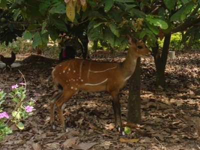Under an African Teak, stood a Harnessed Bushbuck, similar to those we have in South Africa. It stood watching us with those huge liquid eyes. As it scratched around in the leaf litter with its dainty hooves, chickens darted closer to peck at the insects and grubs that it had uncovered. A large Turkey Cock lumbered closer to get into the action, and was chased away by the Bushbuck… There seemed to be an unusual pecking order here! The Bushbuck tolerated the chickens, but seemed to dislike the turkeys…!