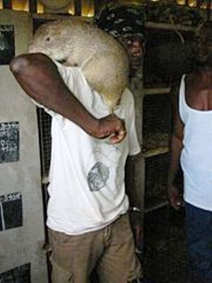 I gaped open-mouthed at the sight and size of the “Grass-Cutter” as it is known locally, but Father assured me that there was an even bigger one lurking around, but that it was a “bit wild” and was wont to bite when it was picked up… When we finally located his “Grandfather Grass-Cutter” it was sitting near a pair of Turkeys, nonchalantly munching on a mango that had fallen from the tree above it. From a distance, I thought it was a medium sized dog…!! It must have weighed at least ten kilo’s and holding the Mango in its jaws, lumbered off at our approach and entered the chicken coop… I was too stunned to speak at the sight of this most monstrous of rodents. It sat next a large red rooster with its back toward us, continuing to bite chunks out of the mango… Meanwhile the first Cane rat we had found was still perched on Joseph’s shoulder while Father led us further into the garden to see his animals… This was one of those bizarre moments you seldom experience in life…leaving me for the most part, mute with astonishment…