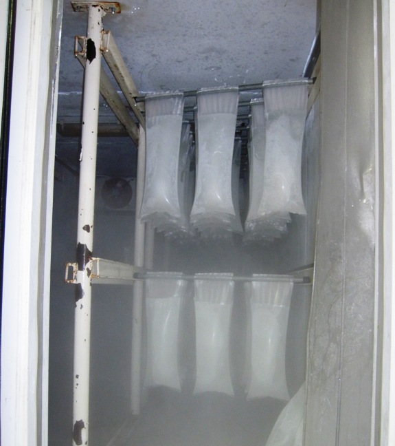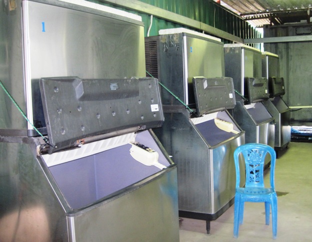 The ice making machines lined up neatly in the factory, work 24 hours a day to keep up with demand...