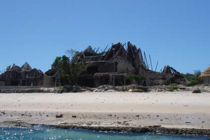 The bay was no deeper than one or two metres at most, and we were able to see down to the ocean floor, all the way across to the island. As we got closer, we noticed the burnt-out ruins of the lodge which had caught fire just a few days earlier… Apparently this lodge had only just been completed and other parts of it were still being built when the fire started… Margoruque is part of the Bazaruto Archipelago National Park, and only a limited number of lodges are permitted to be built on these islands. A small village is perched on the seaward side of the island, and I assume the labour that worked on the building, and would later work in the lodge, would be drawn from here.