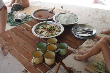 The crew had meanwhile been preparing lunch and we waited in the shade, wondering what would be served up for us… While the cook chopped onions and tomatoes for the salad, the skipper and his mate carried a large bowl of rice and a covered silver dish up onto the beach and set it down on the table… The lid was lifted to reveal an aromatic and very tasty calamari stew!!! A large bowl of bread-rolls was also brought to the table with the salad, and we tucked into what was a wonderful meal… Slices of pineapple and peeled bananas were later brought to us, and a very large urn of pineapple juice was set down along with a batch of tin mugs… Paradise the easy way…