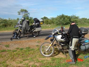 We rode slowly through the Reserve, with me in the lead, as I preferred to stay as far away as possible from the noise that Allan’s bike makes, believing that if any animal was to become annoyed with us, they would go for him…!! That was my theory, and it worked…!! As I passed the various animals, they would look up and then relax again, but when Allan went past them, they scattered into the bush… We saw elephant, but luckily they were too far off the road to be a problem, and the distance to the border post was covered without any opportunity for interesting photos of Allan being chased by various forms of wildlife, intent on putting an end to the noise generated by his Dakar… Our Dutch friends brought up the rear in their rented 4 x 4…