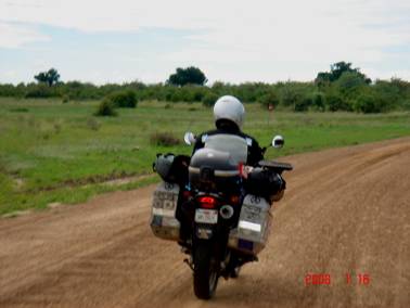 The next 70 kms to Tsao was ridden in blazing sunshine, and our kit was soon dry again. We motored on to the turnoff at Senithwa, which lies on the edge of Lake Ngami, and turned northwest, onto the C3 for the long run into Maun… The rain caught us again at Toteng, and although it was not as hard as before, it still managed to make for uncomfortable riding… Just before this, we had stopped to put our cell phones and wallets back into zip-lock plastic bags, and buried them as deep as we could in our panniers… We were old hands at sorting our phones out by this stage…