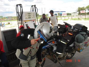At Sepupa, the road cuts away from the edge of the swamps, to rejoin it about 40km later at Etsha. A little further on, we came to Gumare, where we stopped to refuel again, as this was the last available fuel before Maun, almost 300km away…. Allan had the petrol attendants screeching with laughter as he cleaned his visor with the sponge apparatus normally used for windshields… I was getting used to his crazy antics by now, and pretended that he was behaving normally…
