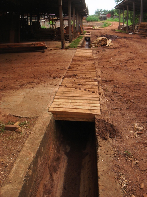 Heavy rain has fallen over the area for the last five or six days, and the mud that gets churned up by the heavy log-moving machinery is something to see ! In front of the sawmill, it is almost a metre deep… I have had all the drains and storm water trenches cleaned out and most of the rain water flows swiftly away. This little exercise was performed by all those workers who had in one way or another, annoyed me… There names were added to the “Drain-cleaning Detail”, and on weekends, they were made to report for work, where they were issued shovels and wheelbarrows, and each given sections of the storm water drain channels to clean. The drains had not been cleared of the mud and debris from previous rainy seasons, for a few years, and although the concrete drains themselves are over a metre deep, some of them were filled to the brim with muck ! This led to a few “flooding incidents” which I was determined to put a stop to ! I also had all of the bridges over the trenches replaced with new blocks of Dahoma, an extremely heavy and hard wearing timber, which allows even the heaviest forklift to ride over them and into the factory without a problem…