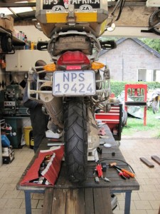 The Big Fella was wheeled into the garage and onto the work table, his old shoes came off and on went a new set… I had managed to get over 19 000 km on the old set, and Chris agreed that under normal circumstances, I would not have had to change tyres, as in his estimation, there were still a few 1000 k’s left in them… I did not however want to carry a spare tyre all the way to Khartoum, 3 000 kms away, and opted to put the new ones on, here in Nairobi…