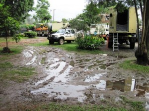 On my way to the Jungle Junction, an oncoming bus forced me off the road, then a taxi went through a mud-filled pothole and covered me in a wall of brown water… By the time I arrived at Chris’s place, I had the mutters in a big way… I took a long look around me when I got there, and realized that I did not have it so bad… The camping area was flooded, tents were hung out to dry, sleeping bags covered the shrubbery and a few inches of water lay where once there was lawn… Had it not been for the generosity and hospitality of the Gauntletts, I would have been hanging my own kit out to dry here!!