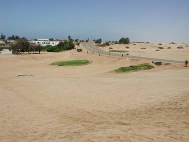 It is a very long way to come to catch fish, but I am told that the cold Atlantic waters serve up great catches of Bronze Whaler sharks and other fighting fish… I idled through town, up and down the wide roads between the houses. A strong wind had got up again, picking up particles of sand which “pinged” off the bike and my helmet… I noticed a very green patch of grass in what seemed to be your ordinary “garden variety” patch of desert, but was astounded when I rode closer, to see that it was in fact a “green”… as in Golf!!! I pulled the bike over and removed my helmet to get a better view of this “course”… I was interested to see that they had actually put bunkers on the edges of the greens!! Interesting touch, considering that the whole course was one massive bunker!!!