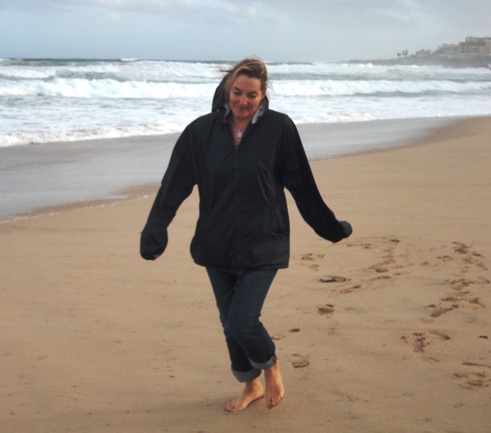 High wind and overcast conditions kept us from swimming, but did not stop us from taking walks on the beach… Or “skips” as Patricia demonstrates here…!!