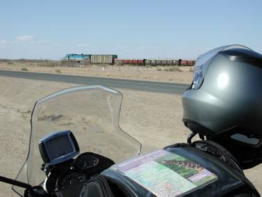 While I was taking in the scenery, I noticed a puff of smoke on the horizon south of me, and a short while later a train came rolling into view. The railway line was just across the road and parallel to my position. The driver hung out of the window and blew his whistle as he passed by… I waited another few minutes and then decided to try and catch him further up the highway… I kitted up quickly, having to pack away the remnants of my lunch…half a packet of ginger biscuits and the rest of my water!