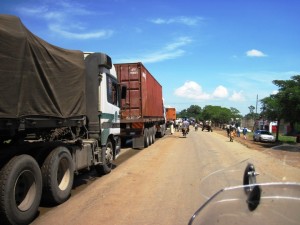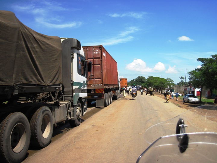Between Bongoma and Malaba on the Ugandan border, the road was even more potholed than before… I passed hundreds of trucks bound for Uganda and Rwanda, churning up what was left of the tar and widening the potholes into craters… I dodged around the smaller ones, and in some places had to ride through the bigger ones, at speeds hardly ever exceeding 20 km/h… For at least 15 kilometres, I do not remember using anything but 1st, 2nd and 3rd gear… There was much muttering inside my helmet…