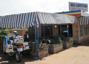 I had planned to stay in Jinja, but having arrived there just after 2.00pm, I decided to push on to Kampala thereby cutting 80 odd kilometres off my next run to Kigali in Rwanda… I rode over the Owen Falls Dam wall, and out to the town of Mbiko, where I stopped at the Nile Cafeteria to have some lunch… I planned to buy a few Samoosa’s or a chipati, but changed my mind when I saw there was a buffet on offer… For Ush 10 000.00, (about R35.00) I had a big plate of goat and chicken stew with four or five vegetables, and a soda… The drumsticks I chose from the pot were the longest I had ever seen!! I would have liked to see the size of the chicken they came from… The goat meat was tough and chewy, but that’s how it usually is… The sauce and veggies were great, and I left only a pile of bones on the plate when I was through…
