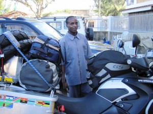 I had a restless night, kept awake by the buzzing of mosquitoes, as well as the noise from the bus station a short distance away… I was up at 6.00 am, packed all my gear, ate a leisurely breakfast, (mainly because it took20 minutes to fry two eggs..) and later, with the assistance of the porter, carted everything downstairs to the waiting bike… I sent Ezekiel to go and buy some cellotape, as I wanted to “strap” the rear brake light cover to its mounting, in case my repair of yesterday was undone on the gravel road… I busied myself ensuring that everything was strapped down securely, the panniers were locked, and the tyres wouldn’t be making contact with the brake light cover again…