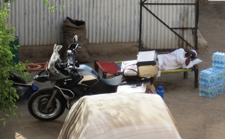 I went down to the little compound behind the hotel to check if the bike was OK, and while I pottered around tying things down, the old security guard wandered over and stood quietly by… Using sign language, I asked if he would keep an eye on the bike… He nodded enthusiastically and then went to a little metal shed and brought out a stretcher, which he placed next to bike…