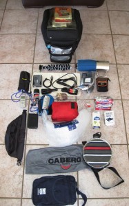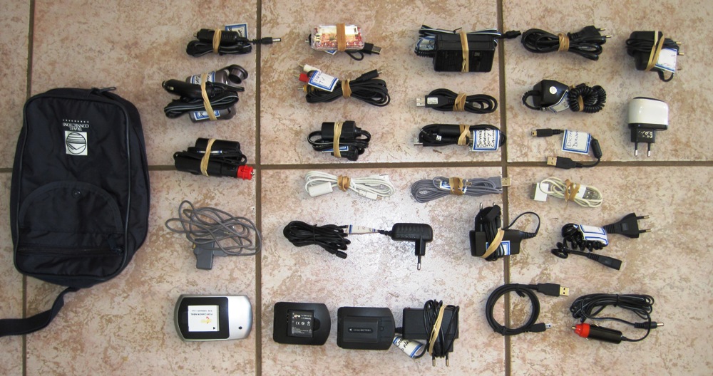 Probably the most important little bag of bits that I will need to ensure that I am able to capture photographs, video, and voice recordings…. A variety of chargers that allows me to charge everything off both the bike, as well as a DC outlet when there is one available… Also cable to download anything and everything digital that I am carrying…