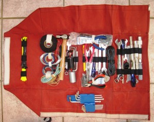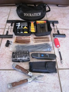 Fully loaded puncture kit with spare rubber compound, extra “worms” and tools to enlarge and thread the worms… A multi-tool with Cable ties for those easy to repair bits that need nothing more than this…