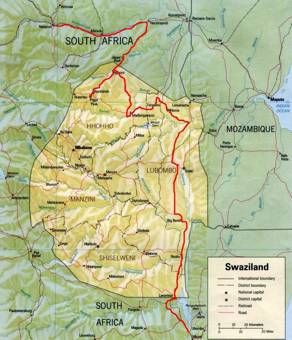I decided to avoid the traffic which would be pouring through the Ezulweni Valley, and chose rather to follow Louis Barnard’s advice to use the newly tarred road which linked up with the road going south, down the eastern part of Swaziland. My route took me back through Pigg’s Peak, past Djakiza (where I said a brief goodbye to Louis, verifying my route down into the Lowveld of Swaziland as I did so…) and down across the Phoponyane River, through Ntonjeni, and just before the Jeppe’s Reef border post, turned right onto the road to Buhle.
