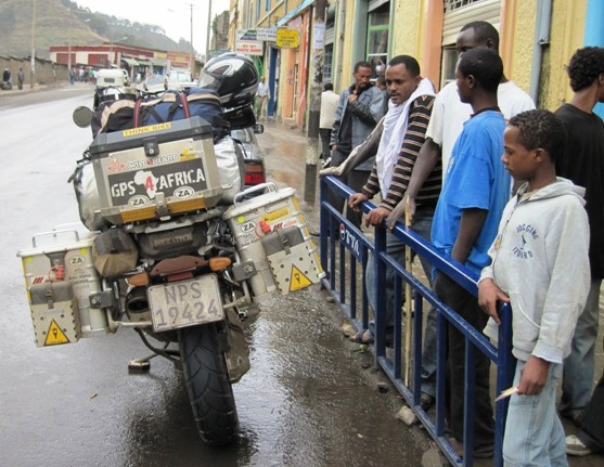 A light rain was falling as I rode up the main street of Gondar… The first hotel I stopped at was the “Quara”. It stands wedged between a dingy little supermarket and “hole in the wall” general dealer, and still looks like the run down government hotel that it once was… I met an Italian guy and his friend, who had ridden their Landrover up from Bela-Bela (Warmbaths) and were on their way to Italy. They had traveled a similar route to the one I had taken, so we were able to share our experiences and laugh about the tougher sections we had ridden through…