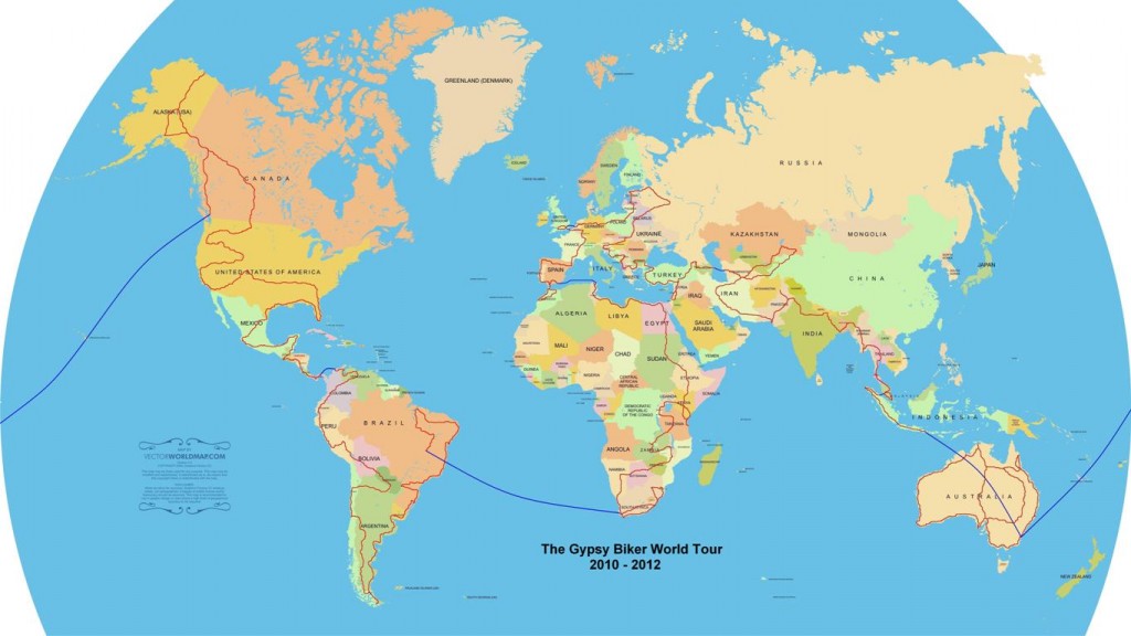 Below you will find a world map which indicates my intended route. There will probably be many changes to my plans, as changing weather patterns and political upheaval make themselves felt !! Over the next few weeks, I will update this site with the planning and detils of what I have to sort out before I can swing into the saddle….