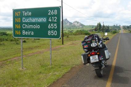 I bid them all farewell and with their shouts of encouragement ringing in my ears, left the border and headed into Mozambique, accompanied by Dire Straits on the I-pod… I stopped a short distance from the border post to take a photo of the first distance marker and realized I was in for a big, big day!!! I was very surprised to see that there were decent road signs in this part of the world, as I had thought that this northern area of the country would be the least developed of all the provinces I would be passing through…