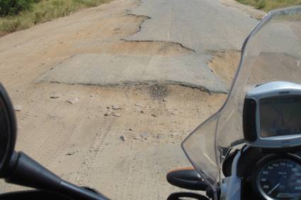 The next 240 kms to Catandica were amongst the worst I had ridden on, and at times I could not avoid all of the potholes I was confronted with, slamming into a few that got the teeth rattling in my head… I was amazed that I did not have a front tyre blow-out, and no matter how slowly I rode through the more difficult sections, I still found myself wrenching the bike up and out of some of the deeper craters in the road… This was tough going…!
