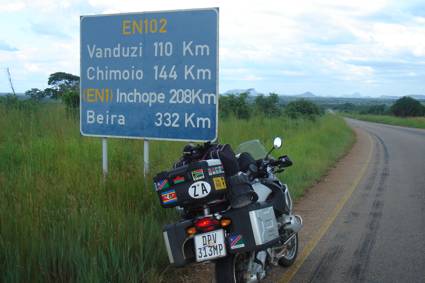 The next 100kms, directly south on the EN102, went by quickly, as the road surface improved considerably, and I was able to maintain a steady 120km/h. The few potholes I came across were easily avoided, and the village of Honde flashed by on either side of me… The light was beginning to fade, and I again hoped that I would not have to ride in the dark to get to Chimoio…