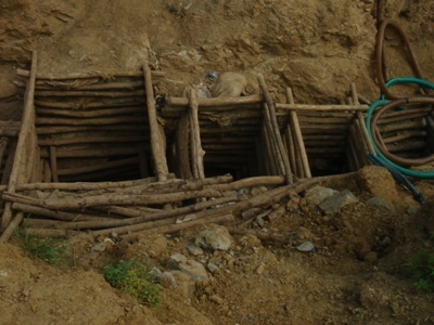 There was only one diesel generator that I could see, and the owner was using it to pump air through leaking pipes to the only jackhammer working below the surface. The gold bearing rock was then brought up to the surface in buckets, taken over to the “crushing area” where gangs of heavily muscled men broke the ore using 10 and 14 pound hammers… Primitive, but effective…