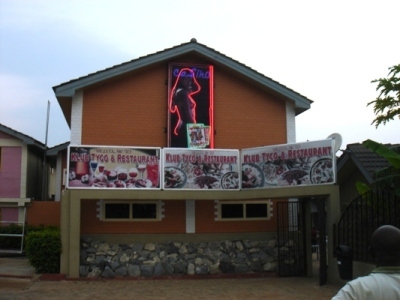 Father surveys the outside of the Tyco Club in Sunyani to ascertain its worthiness… Or is he looking at the advert above the sign…?