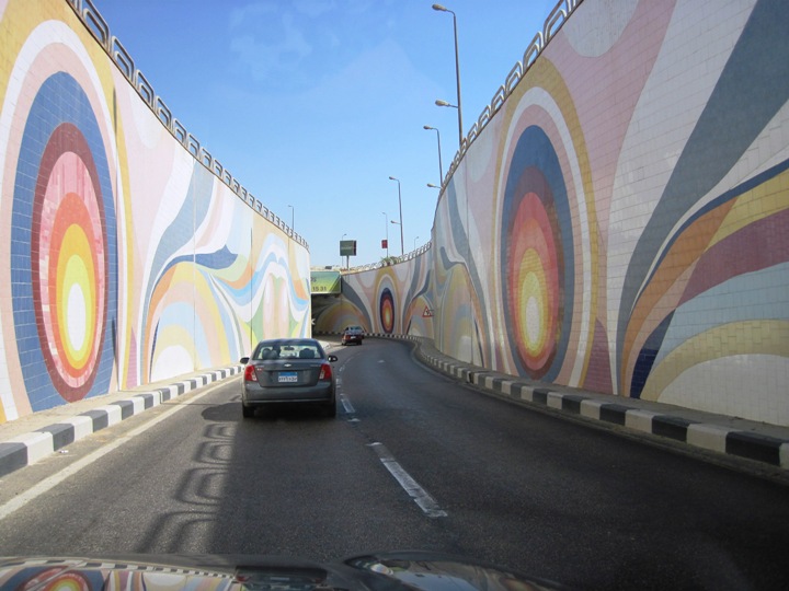 Concrete interchanges have been brightened up by using tiles to make these huge murals... Great idea...!!