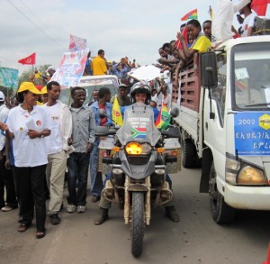 To the west of Dilla lies the large Lake Abaya, and just south of that, Lake Chamo. This appears to be the beginning (or end, depending from which direction you are riding) of Ethiopia’s “Lake District”… About 85 kms north of Dilla is Lake Awassa. The town bearing the same name is located on its eastern shores, and as I approached the outskirts of this large and well laid out town, I rode into the middle of a 20km long convoy of trucks and buses, carrying supporters of the largest political party in Ethiopia… In order to work my way past them without fuss, I joined in the bedlam, keeping my finger pressed down on my hooter and waving wildly in support of whatever it was they were celebrating… I cleared the convoy after half an hour of near misses, flags being draped across my visor, pats on the helmet etc…