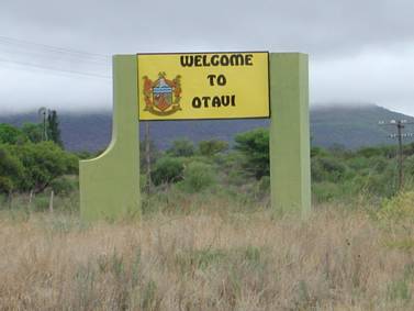 Just before the town, I crossed the Omaruru River and it was in full spate…!! Only kidding…dry as the proverbial bone….! I refuelled across the road from a group of wood-chip and firewood hawkers, who came over to enquire if I needed any firewood…. I asked for four bags, and one of them was gullible enough to run back across the road to begin lugging them over. These bags were of the 50kg variety at least, and where he thought I was going to put one, let alone four, is beyond comprehension. His mates realized I was joking, and shouted across for him to put the bag he had hoisted onto his shoulder, down. They teased him mercilessly after that, and he retired to a nearby bus stop to sulk…