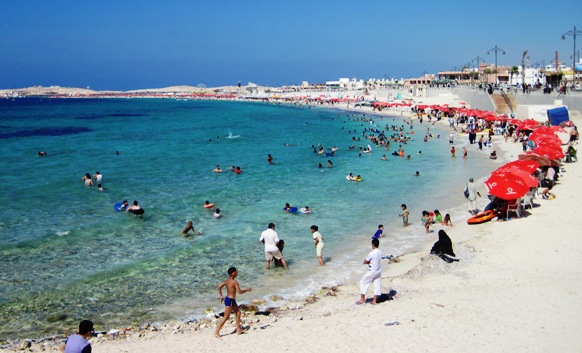 From the balcony of my room, I could see a small piece of the ocean, and watched jet-skis cavorting in the choppy water, often coming dangerously close to the folk wading out into the shallow waters for a cooling swim… No rules here regarding specific beaches for jet-skis… Motorboats plied the deeper channel just a few hundred metres offshore, where the darker water was lined with rubber buoys… After the filthy beaches I had seen in Alexandria, this was a paradise in comparison… I think that the fact that it is so far from Cairo, has meant that fewer people visit this little town, and it has retained its pristine beaches and relaxed atmosphere…