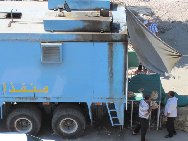 Below me in the street, I watched in amazement as a large blue trailer pulled up, and within minutes, people began queuing at the back doors, buying bread that was being backed in the trailer! A mobile bakery!! What will these guys think of next!!