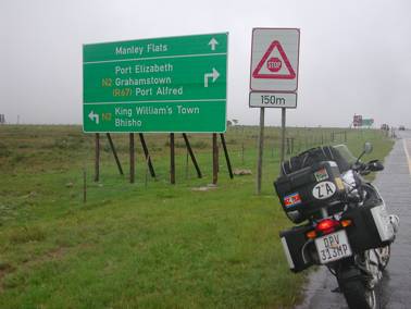 About 20kms south of Queenstown, where the R61 meets it, I turned south onto the N6, and dismounted again to adjust my backpack. Whilst doing this, three riders on their BMW K1200T’s stopped to chat. They were on their way to East London, and after a short chat, we headed south for Cathcart where I knew I would have to refuel. They had filled up in Queenstown, and had enough fuel to get them to their destination on the coast… They waved to me as I turned off into the last service station on the edge of town, in what was still pouring rain… Having refueled, lit up a much needed cigarette and sent sms’s to Renske confirming my later arrival in Port Elizabeth. I sat contemplating my options. I could ride in the rain…or I could ride in the rain… Decisions, decisions… I could go south-east towards Stutterheim and East London along the N6, or through the “sticks”, south-west towards Fort Beaufort… The adventurer in me chose the latter….bad move!!