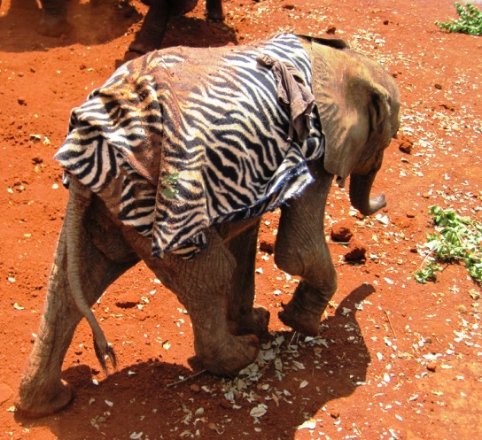 Each handler is assigned an orphan when it is brought to the sanctuary, and forms a very strong bond with the animal. The elephants are taken for walks in the neighbouring Nairobi National Park, during the day, and are housed in their own individual stables at night. Each handler sleeps in the stall with “his” elephant, which he covers with a large blanket before “putting it to bed”…