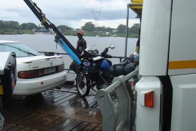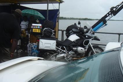 The ferry finally docked, and two trucks drove off, causing the ferry to rock in an alarming manner. I looked over at Allan, who shouted that he had seen worse, and drove up and onto the deck before I could think of a suitable reply… I followed him up the slanting, slippery surface, rain obscuring my vision. The “ferry master” was berating Allan for parking on the wrong side, and I nearly rode over him as he dashed across the deck in an effort to get Allan to move. I heard Allan shout, “Fuck off and drive the ferry!” to the startled skipper, who had stopped in his tracks and stood in the rain gaping open-mouthed at Allan, who had dismounted, turned his back, and walked over to the railing…. “This could be interesting,” I thought, and parked as far away from Allan’s bike as I could… I had visions of his bike being pushed into the Zambezi by the annoyed skipper and his crew…