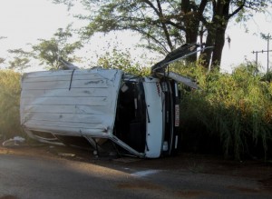 back of a large truck as it tried to overtake it, and had rolled off the road and came to a halt on it’s side… The passengers stood close by under the shade of a large tree…the truck stood parked in the middle of the road, where police had told the driver to leave his vehicle. Fortuneatly, the accident had taken place on a long straight section of road, and the scene of the accident had been cordoned off, so there was no danger for passing motorists.