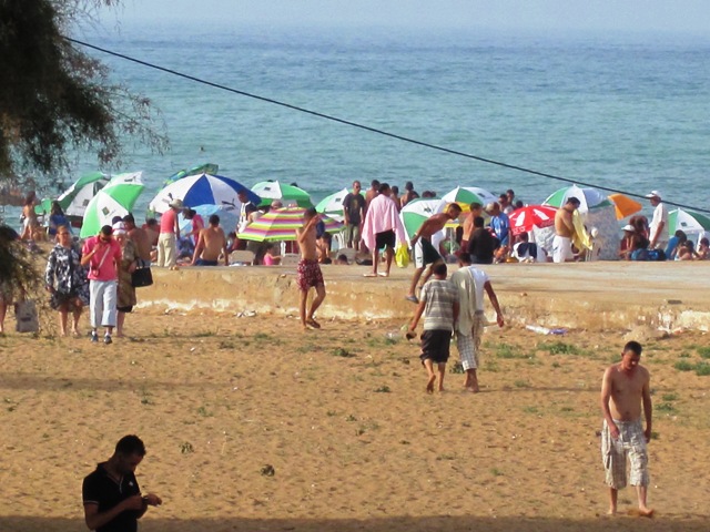 The streets were clogged with traffic, crawling along at less than 20 km/h… I switched my brain over to “Drive like an Egyptian”, and got onto the painted line separating the two lanes, put my spotlights on, and cruised down the centre of the busy road, waving oncoming cars away like I was the lead motorcycle in a presidential convoy… It worked most of the time, and I got to Tipaza at least an hour before I would have, had I sat behind a car and puttered along like they were doing… All along this narrow coastal road, cars were pulling onto the dirt shoulder, unpacking picnic baskets and walking the few hundred metres down to beaches hidden behind the dunes and low brush… At some places, wide areas had been bull dozed to allow parking, and these were crowded with weekend holiday makers, all vying for their place in the sun… It was chaos on a massive scale…!!