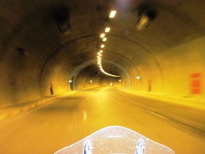 I marveled at the massive bridges that had been built to join one side of a mountain to another… Some of the concrete pylons holding up the road were over a hundred metres tall, and where the highway could not go around a mountain, it simply cut straight through it… A system of impressive tunnels forms part of the Auto Route, and riding through them at high speed was both exciting and scary… Most traffic in the fast lane was traveling at about 140 km/h, and never slowed down through any of the tunnels, some of which ran through a few curves before exiting on the far side of the mountain that they have been built through…