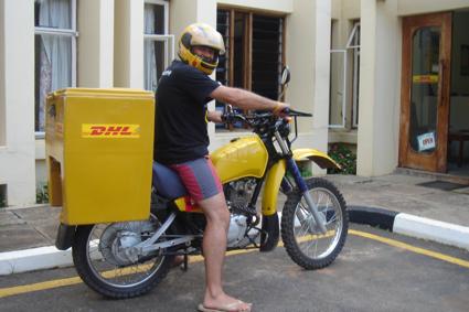 The sun finally came out of hiding, the rain stopped and we decided to get the bikes washed by the staff at the hotel… Afterwards, we rode them back to the entrance from the wash-bay, and again parked out front, where many people stopped to admire them… At the DHL office next to the entrance, we spent some time enquiring about flying the bikes to Dar es Salaam… The manager spent an anxious few minutes trying to dissuade us, but we finally convinced him to work out a price based on 300kg per bike… His calculator did not have a screen big enough to do the calculation, and just as he was about to go to the hotel to look for a bigger one, we advised him that we had changed our minds, and were actually there to apply for a job as delivery boys… We produced our licences and asked him to make photocopies to attach them to our applications… We told him that we had been sent by the Lilongwe office to improve the delivery times as they had been found to be unacceptable… We eventually tired of this game, as the manager was taking us all too seriously…