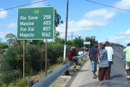 I rode quickly east through Gondola and on to Inchope on the EN6, and then turned south onto the EN1 and into the province of Sofala, where I came across another of those road signs which made my heart sink… Rather than give mileages in small quantities the closer you get to your destination, they save on road signs and put up a sign every few hundred kilometres, showing distances that are hardly designed to encourage a lonely traveller… Vilanculos lay a further 150km beyond Rio Save… A cyclone warning had been issued for the area I was riding into… Clearly the rain was not finished with me…!