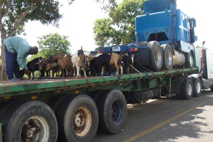 I slowed down to take a picture of a guy tying a flock of goats down onto the flat-deck of a truck, wondering how these poor animals were going to stay on their feet while this truck drove helter-skelter through the potholes which were waiting… Obviously this method of transporting livestock is common practice, as this same truck roared past me about 100kms later while I was taking a mid-morning break on the side of the road. The goats seemed fine, although some of them were standing on top of others!! They seemed to be enjoying the ride…. If they were having a hard time, their bleats of fear must have been carried away on the wind!!