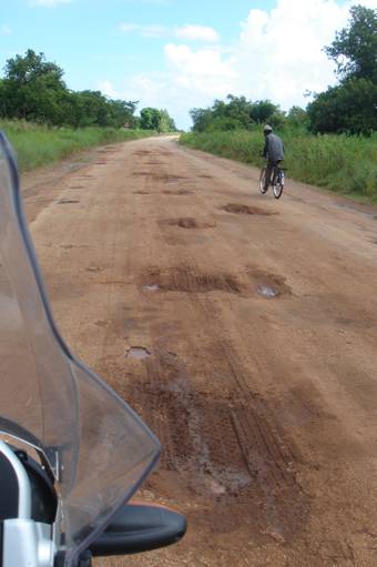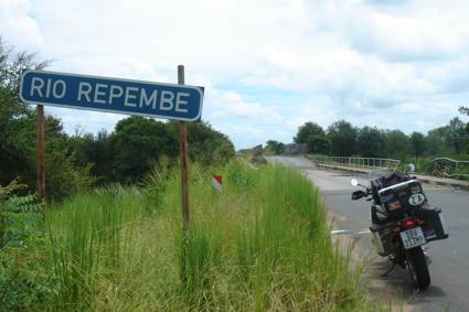Brunch over, I mounted up and rode over the dry Guengere River and the fast flowing Nhapimbi River and into the settlement of Casa Nova. A short distance further on I came to the outskirts of Muxungue, where a police road-block had backed traffic up for a few hundred metres… I rode slowly to the front of the queue and was relieved when the officers waved me through without stopping me… I stopped to refuel at a Total Service Station, first filling my tank with the additional fuel I had been carrying, and then topping up with a few litres from the pumps…