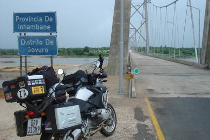 A short distance from Inchope, I crossed the Pungoe River again, which I had crossed for the first time just before the T-junction that had taken me into Chimoio the afternoon before. I was keen to get as much distance under my belt before the bad weather I had been warned about arrived to hinder my progress, and thundered through the village of Mutundiri and over the bridge of the Revue River. The Chimanimani Mountain Range separating Mozambique from Zimbabwe loomed far to the west of me as I kept the revs up, knowing I could burn fuel as I was carrying an extra 10 litres with me, which gave me a range of over 500km…