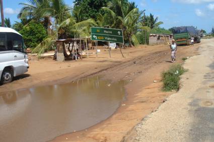 The entrance to town, and the road which dips towards the sea and the centre of Inhassoro…