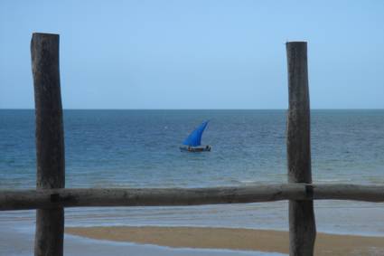 The large portion of fish and chips arrived and was cooked to perfection… I ate slowly, enjoying the company and relishing the fact that I did not have to worry about where I would be staying tonight or the unloading of the bike… It was an 80km doddle back to Vilanculos and I still had five hours of daylight to do it in… I watched a smallish dhow with a bright blue sail cruise slowly past the deck, its occupants waving at me when I stood up to take a few photos of them. Once again I wished I had brought the bigger camera with me on this trip, as I would have liked to get a clearer picture of them with the longer lens… They sailed further up the coast and then brought the dhow closer into shore and furled the sail in preparation for a landing on the beach…